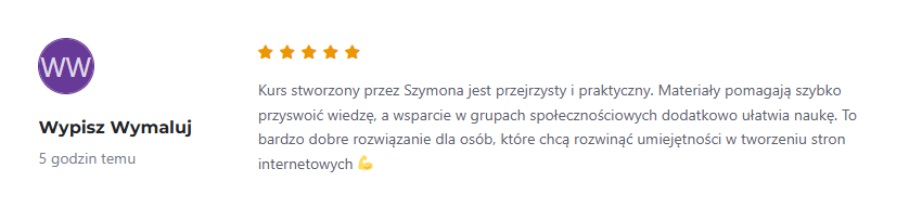 Dla moich kursowiczów udostępniam prywatną grupę na Facebooku oraz kanał na Discord gdzie możesz rozmawiać ze mną i innymi kursantami.